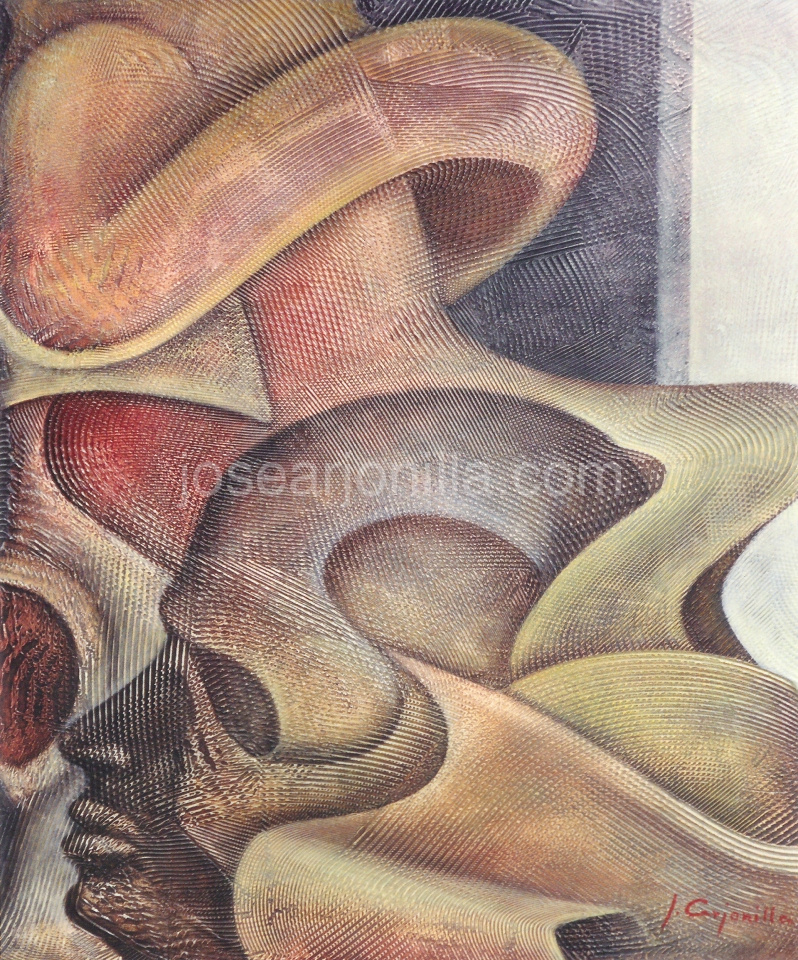 La obra de José Arjonilla. Todo un artista en la frontera de lo figurativo y lo abstracto. Un mundo aparte que lo atrapa y ofrece. Técnica contenido y mensaje. Círculos nuevos; todo muy trabajado con hallazgos de cromatismo sugerentes o, en otros lienzos, aplica mucha materia para lograr, tal vez, efectos cósmicos o siderales. Redes mallas tras las cuales nos muestra una nueva luz.